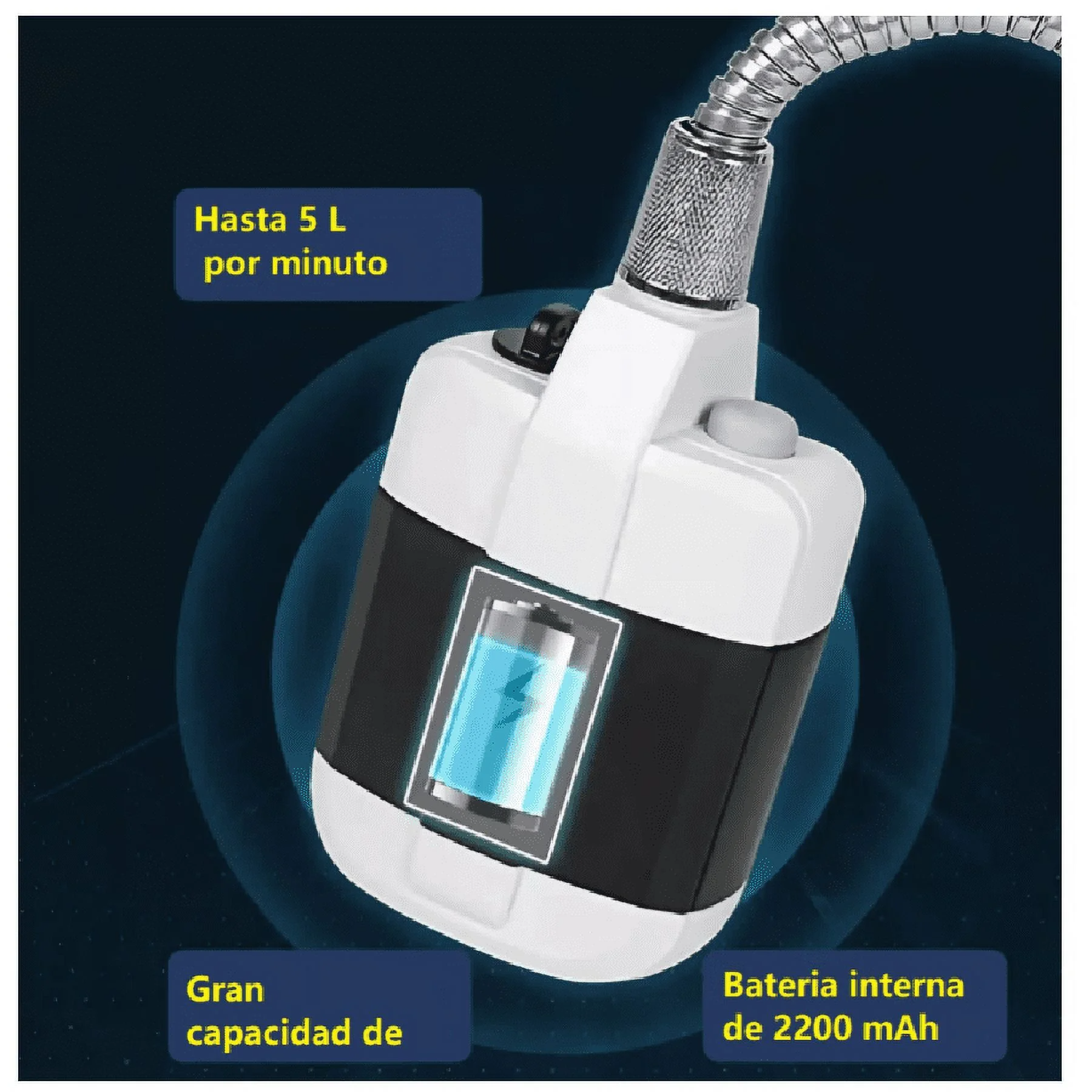 Gracias a su batería recargable de 2300 mAh y su bomba resistente al agua, tendrás hasta 45 minutos de uso continuo. Perfecta para lavar, regar plantas o incluso bañar mascotas.